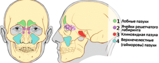 Насчитывают придаточных пазух носа три пары, а также пазухи, названные решетчатыми, которые расположены в решетчатой кости черепа (место между лобной и клиновидной пазухами) и все они укрыты изнутри слизистой оболочкой, очень чувствительной к вирусам, бактериям и прочей пакости.